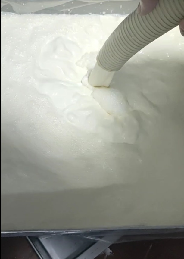 في بعض الحالات بيظهر رغوة أو فوم على وش الصواني أثناء التعبئة. لو الرغوة دي اتجمعت على الطرابيزات ونزلت في الجارات، هتظهر على سطح الشرش، وتدي إيحاء إن فيه تلبين، لكن في الحقيقة الجبن سليم تمامًا.