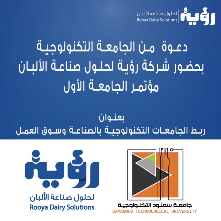 دعوة كريمة من الجامعة التكنولوجية بسمنود بحضور شركة رؤية لحلول صناعة الألبان مؤتمر الجامعة الأول بعنوان ربط الجامعات التكنولوجية بالصناعة...