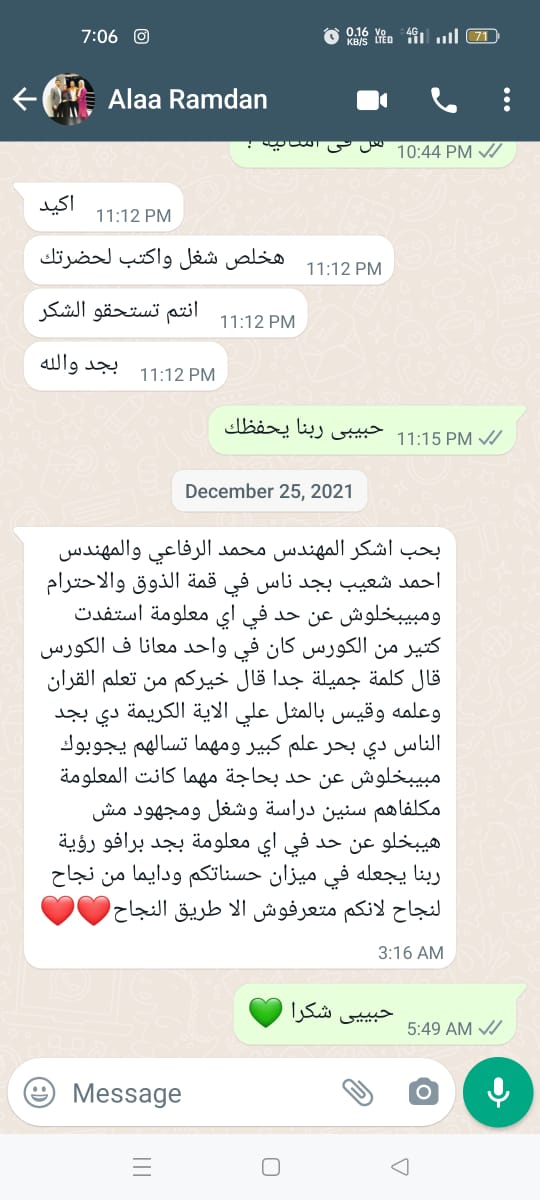 بحب اشكر المهندس محمد الرفاعي والمهندس احمد شعيب بجد ناس في قمة الذوق والاحترام ومبيبخلوش عن حد في اي معلومة استفدت كتير من الكورس كان في واحد معانا ف الكورس قال كلمة جميلة جدا قال خيركم من تعلم القران وعلمه وقيس بالمثل علي الاية الكريمة دي بجد الناس دي بحر علم كبير ومهما تسالهم يجوبوك مبيبخلوش عن حد بحاجة مهما كانت المعلومة مكلفاهم سنين دراسة وشغل ومجهود مش هيبخلو عن حد في اي معلومة بجد برافو رؤية ربنا يجعله في ميزان حسناتكم ودايما من نجاح لنجاح لانكم متعرفوش الا طريق النجاح❤❤