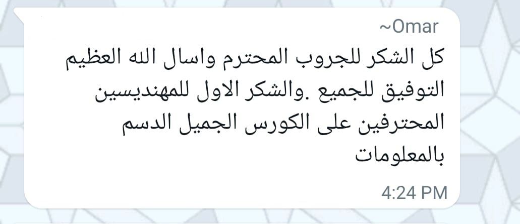 كل الشكر للجروب المحترم و اسال الله العظيم التوفيق للجميع والشكر الاول للمهندسين المحترفين على الكورس الجميل الدسم بالمعلومات