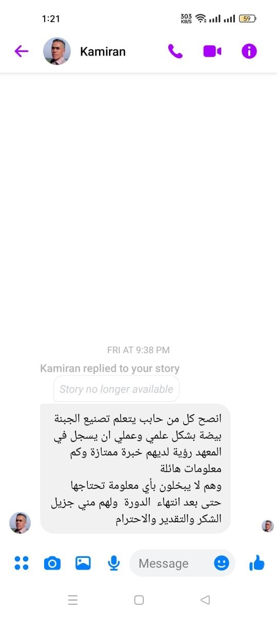 انصح كل من حابب يتعلم تصنيع الجبنة البيضا بشكل علمي وعملي ان يسجل في المعهد رؤية لديهم خبرة ممتازة وكم معلومات هائلة وهم لا يبخلون بأي معلومه تحتاجها حتى بعد انتهاء الدورة ولهم مني جزيل الشكر والتقدير والاحترام