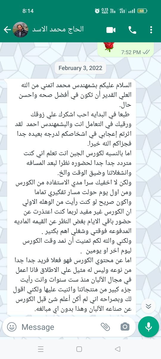 اما عن محتوي الكورس فهو فعلا فريد جدا جدا من نوعه وليس له مثيل علي الاطلاق فانا اعمل في مجال الألبان منذ ست سنوات وانت رأيت جزء كبير من منتجاتنا واثنيت عليها ولكني اقول لك وبصراحه اني لم أكن أعلم شئ قبل الكورس عن صناعه الألبان وهذا بدون اي مبالغه.