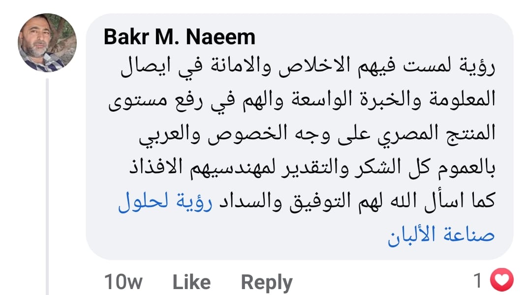 رؤية لمست فيهم الإخلاص والامانة في إيصال المعلومة والخبرة الواسعة والهم في رفع مستوى المنتج المصري على وجه الخصوص والعربي بالعموم كل الشكر والتقدير لمهندسيهم الافذاذ كما اسأل الله لهم التوفيق والسداد